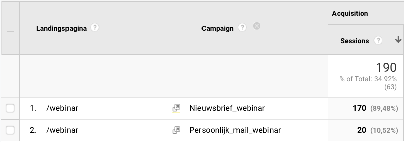 Door te meten hoe vaak de landingspagina is bekeken zie je hoeveel personen op de pagina zijn geweest in de afgelopen periode. Wat je nog niet weet: zijn mensen op die pagina terecht gekomen via het persoonlijke bericht of via de nieuwsbrief? Dit is het moment waarop campagneparameters van pas komen. Je kunt zo namelijk de herkomst van je verkeer inzien en de effectiviteit van je campagnes vergelijken.
