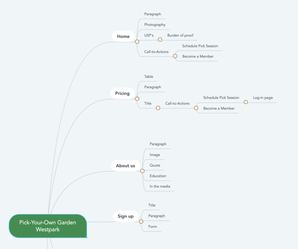 Next, visualize the structure of your new website by making a mind map. A mind map offers a useful bird’s eye view of the project. Mind mapping lets you map out the different sections and pages you want to include and the types of content you will need. If you’re working as part of a team, different people can easily contribute their ideas.