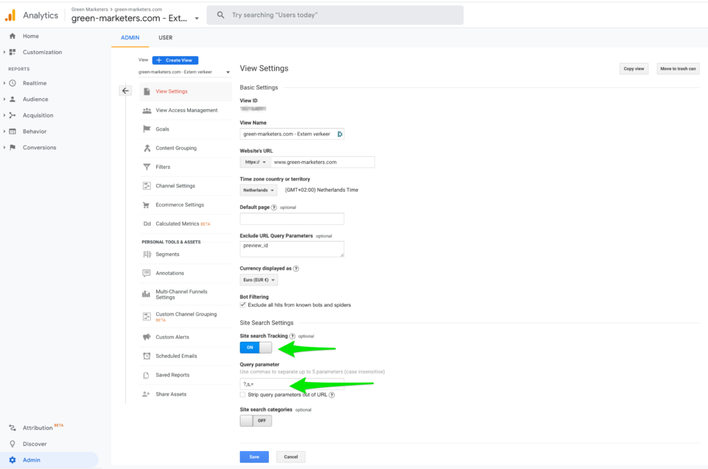 Log in to Google Analytics and click on ‘Admin’. Select the account, property, and view that you need. Go to ‘View Settings’ in the ‘View’ column. Next, turn on ‘Site Search Tracking’ under ‘Site Search Settings’.